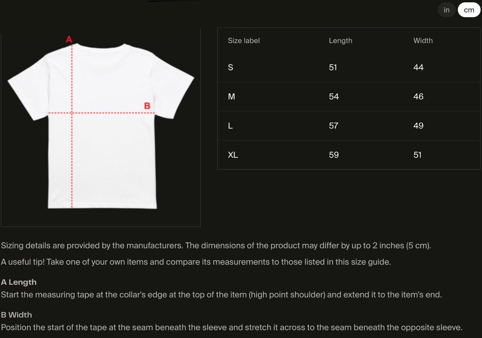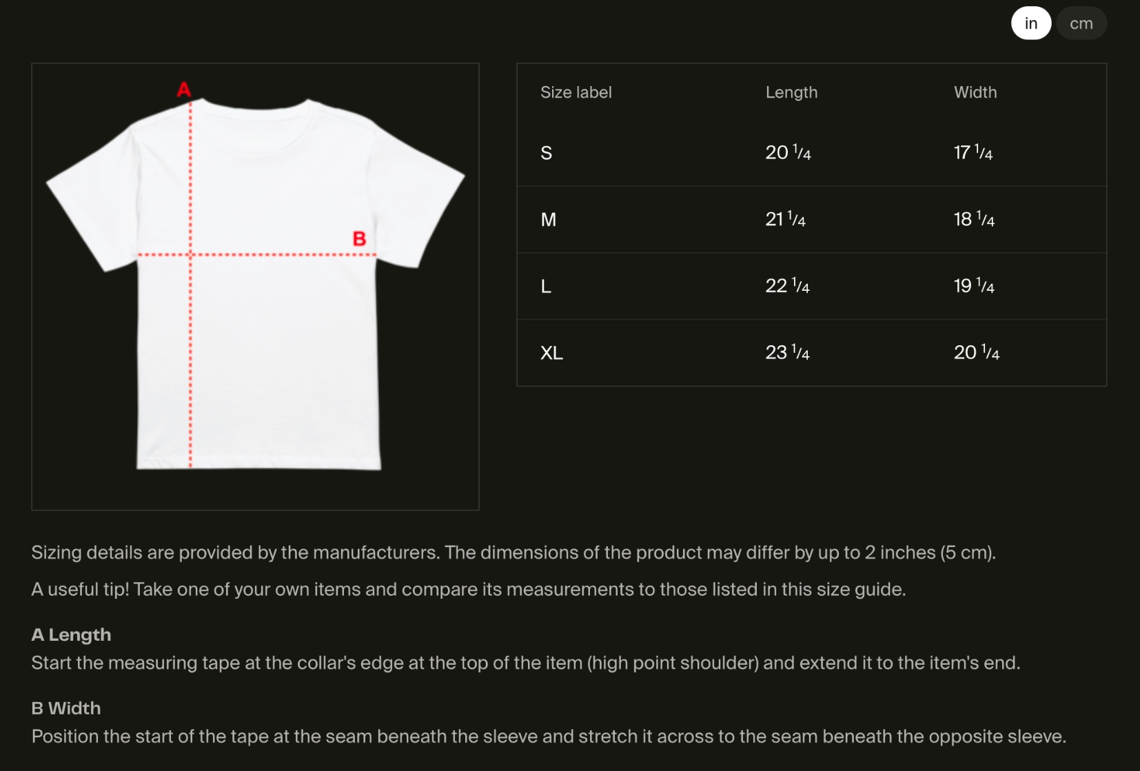 Size guide in in/cm